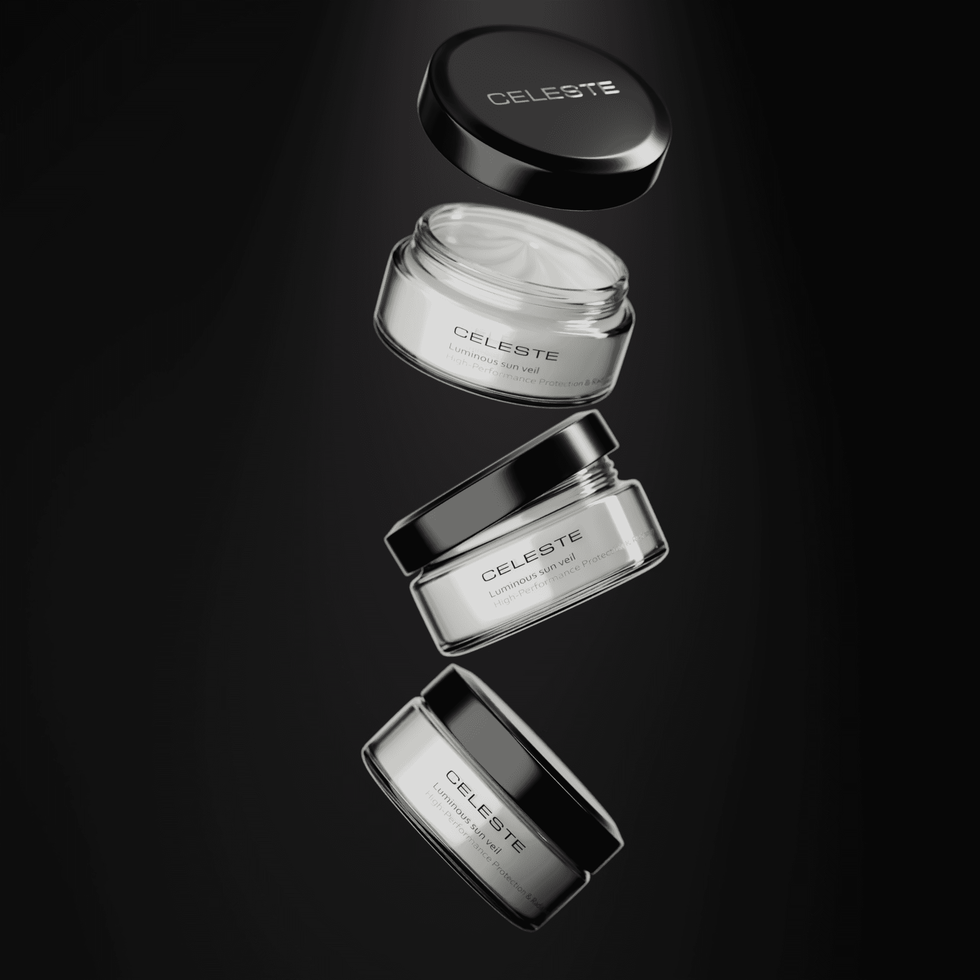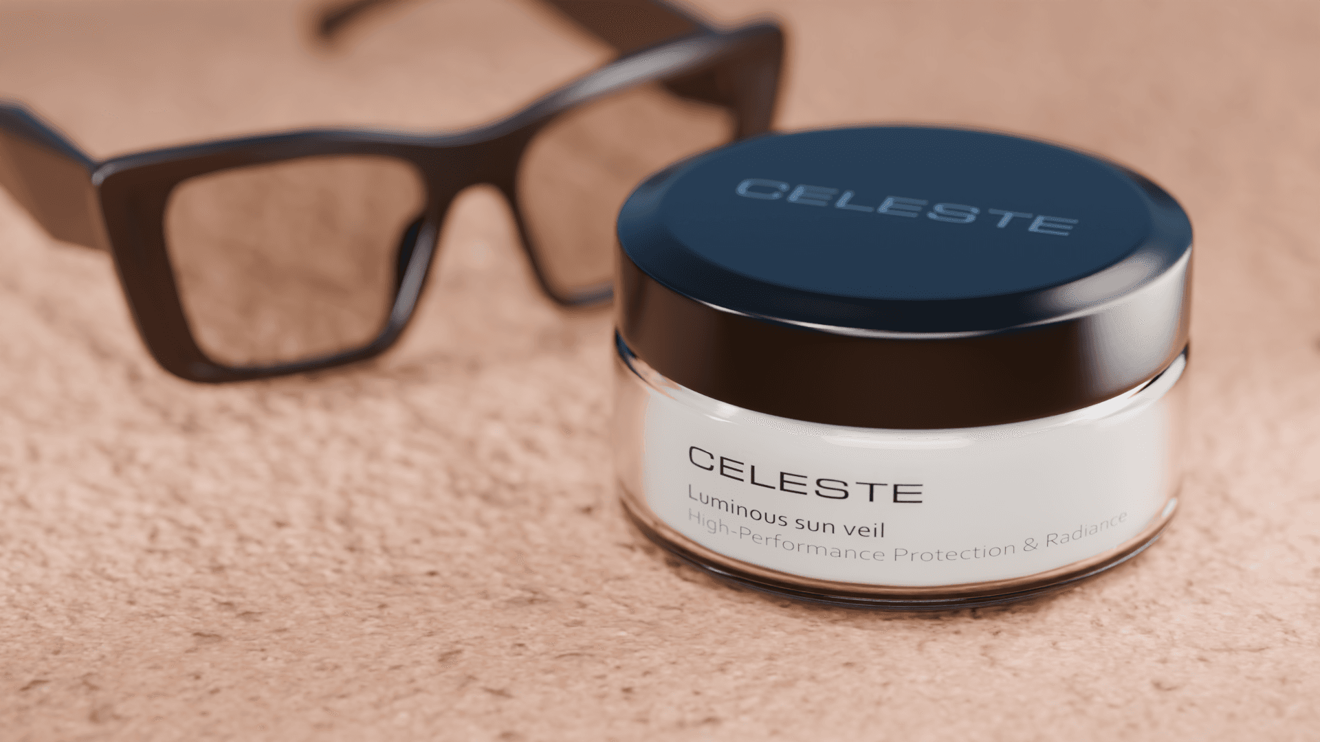 A 3D visualization of the CELESTE sun cream highlights its sculpted silhouette, soft reflections, and elegant tonal balance. The composition focuses on purity and sophistication, allowing the product’s identity to emerge through subtle light play and carefully controlled materials. Working with such beauty‑oriented objects is especially inspiring, as the visual language of skincare invites precision, calm, and a sense of elevated care.
